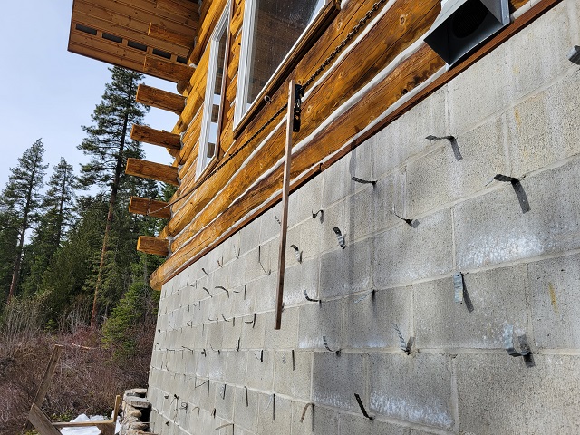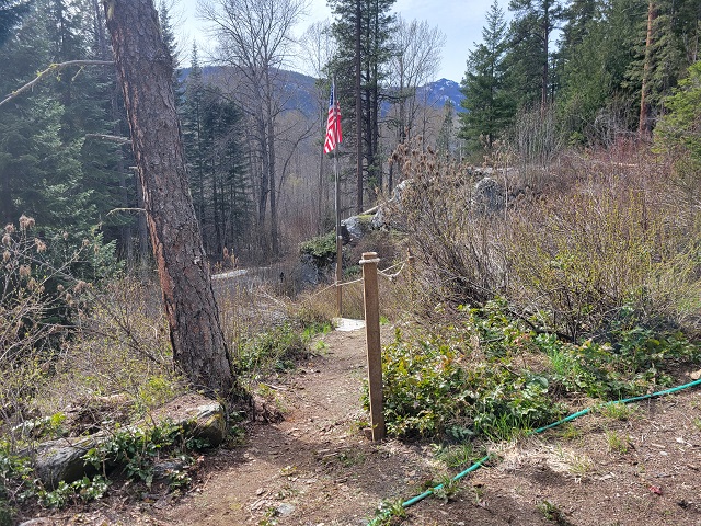 4/9/24 This is the new extension of the handrail serving the concrete staircase and the trail above it. The trail can get a little treacherous during the winter when the snow slides off the cabin roof and overflows onto the trail. Having a rail to hang onto will help. The post in the foreground and the rope connected to it are the recent new additions.