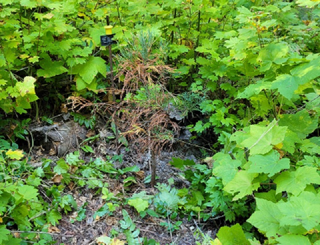9/19/24 I was appalled to discover how overgrown the brush around the sequoia trees had gotten. I pruned the brush away from the worst of them, among which was Ellen that you see here. This picture is after the pruning and it shows a very sick tree. I hope it can recover.