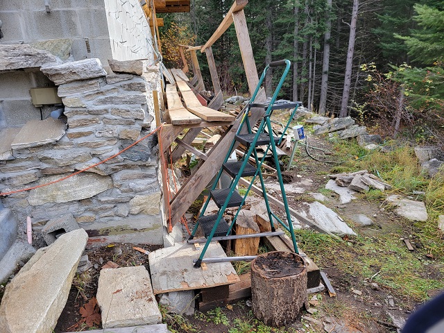 11/8/24 Here you can see the scaffolding that is ready to give me access to work on the stone wall as it grows. I will use it to install some wall ties yet this winter as well as some other incidental items, but the main use will be to finish laying up gneiss stones in the upper part of the wall in the spring when I can again safely use mortar without it freezing. In the foreground, you can see the stepladder I will use to climb up onto the scaffold planks.