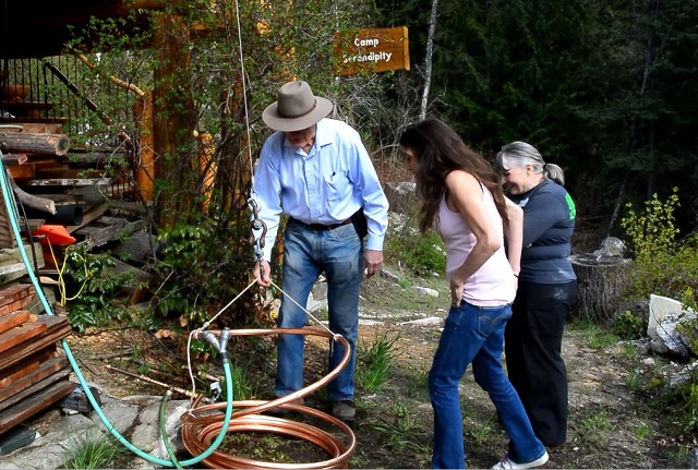 4/30/19 Marianne and Mylynda stopping by for a visit just as Paul is testing the hydraulic ram pump he made. The pump worked for the first time ever while they were watching.