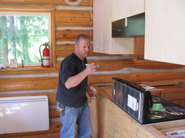 6/12/10 Bob Faulkner of Moonlight Tile & Stone using his special computer to measure the dimensions of the kitchen cabinets in preparation for making the granite counter tops.