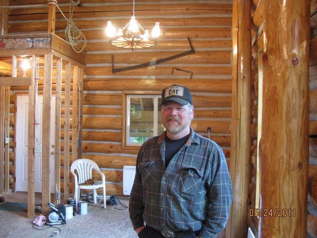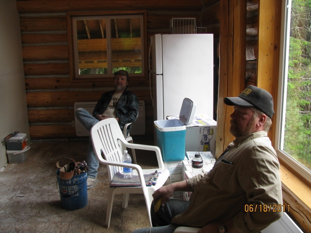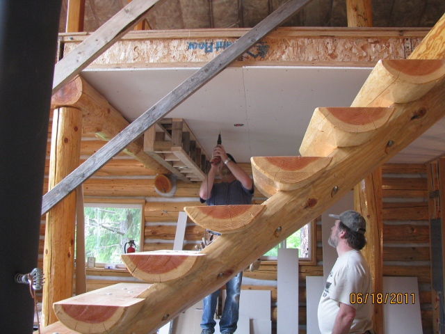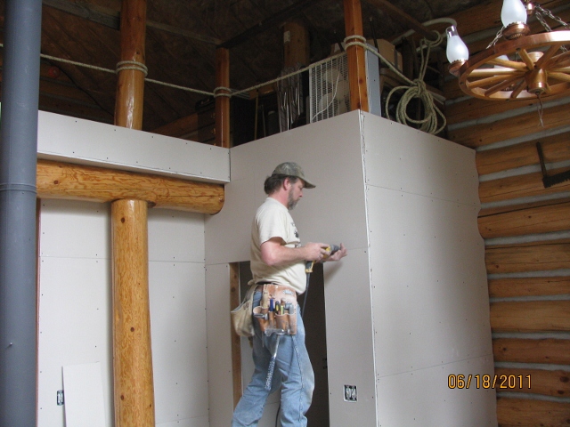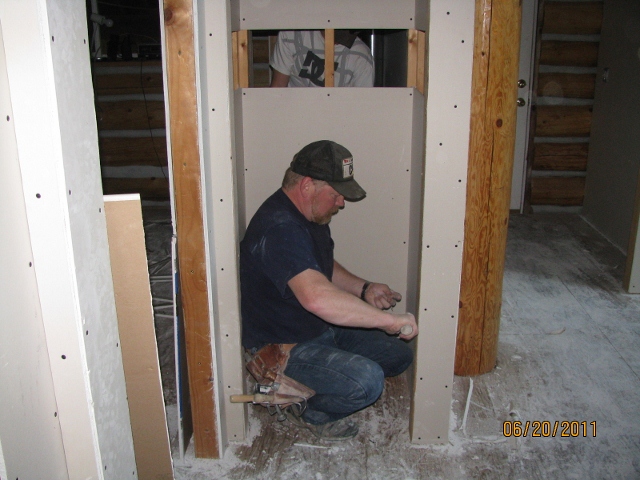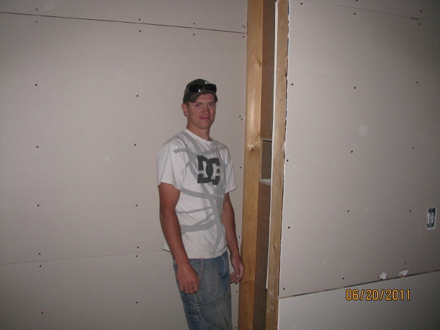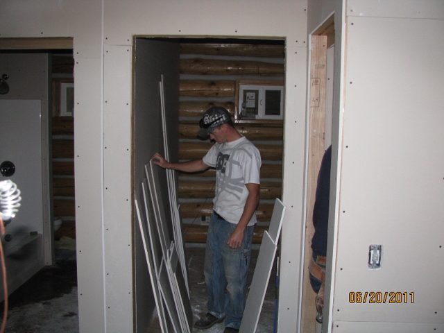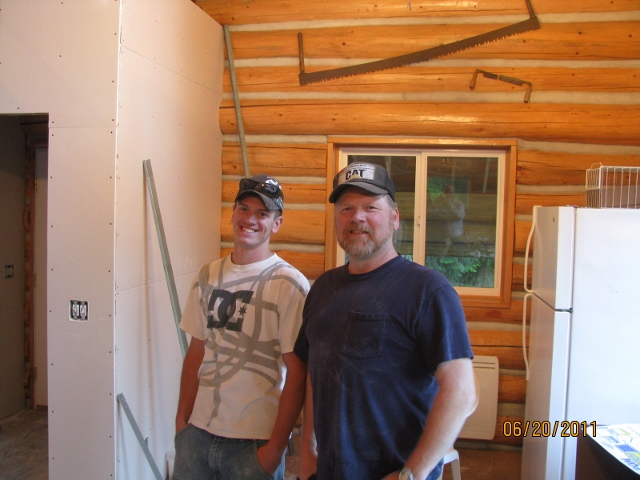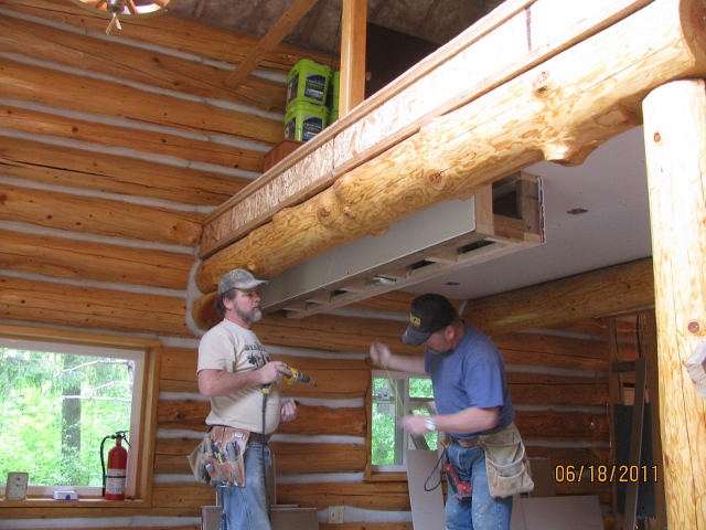 6/18/11 .Ron and Gary attaching drywall to the kitchen ceiling.