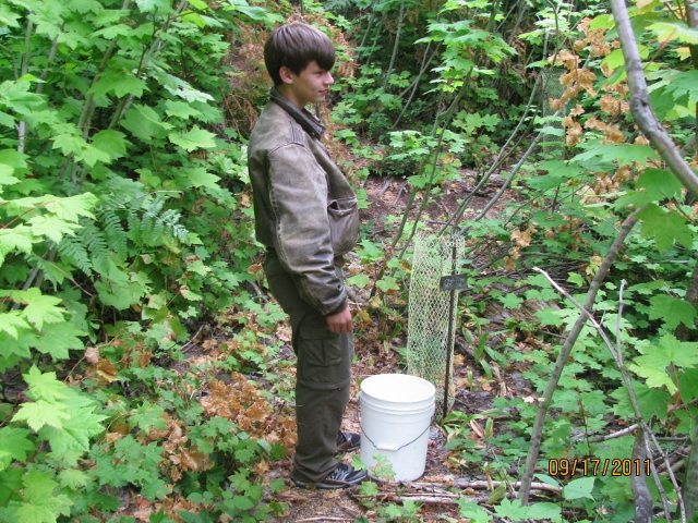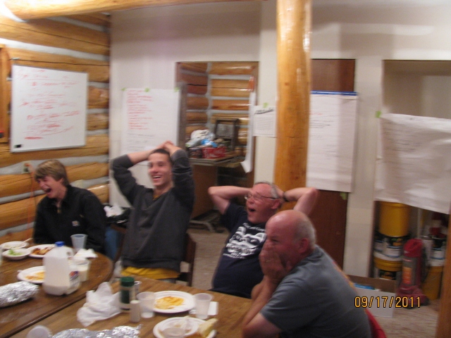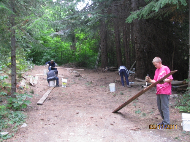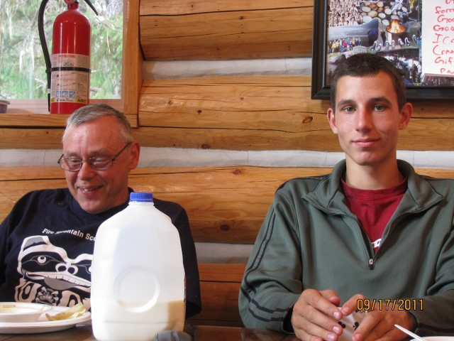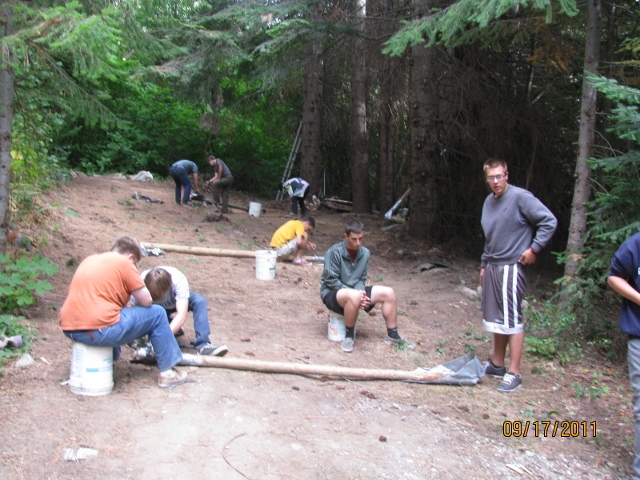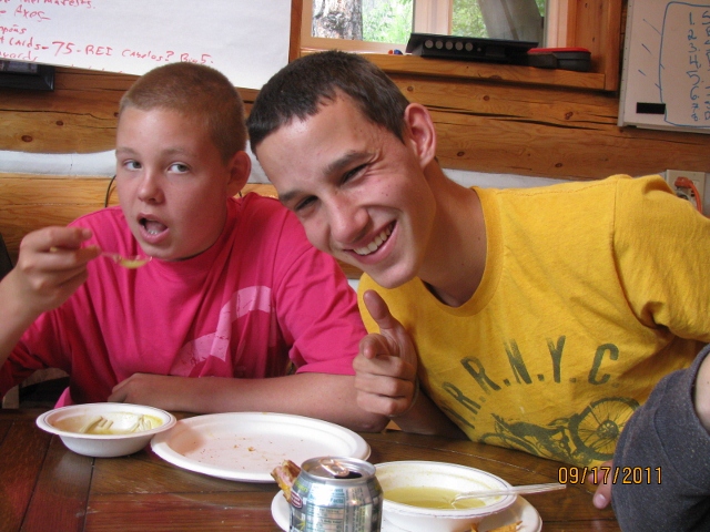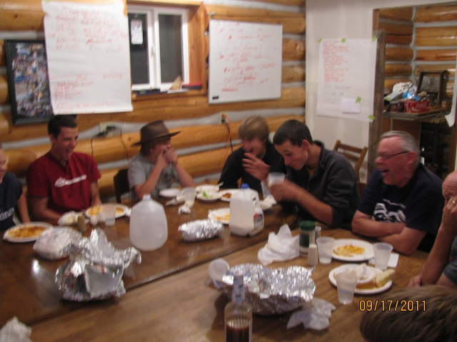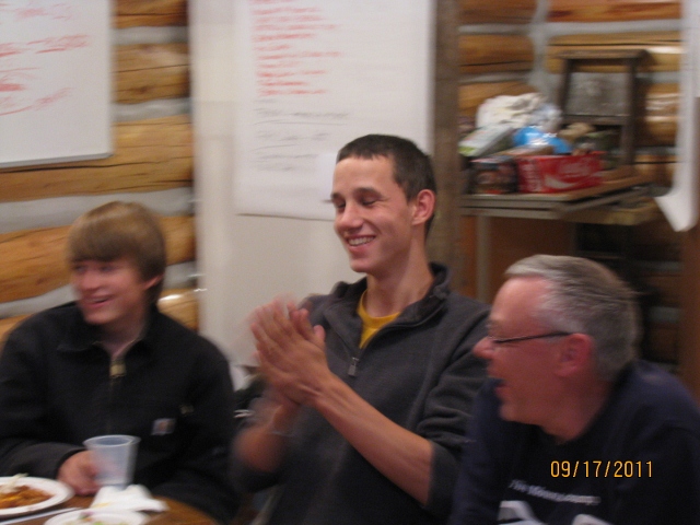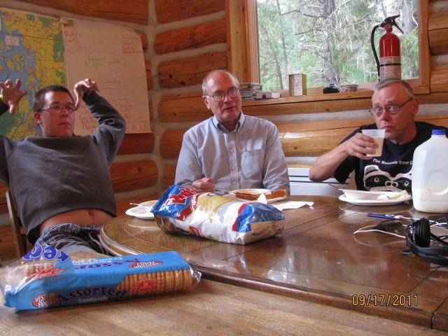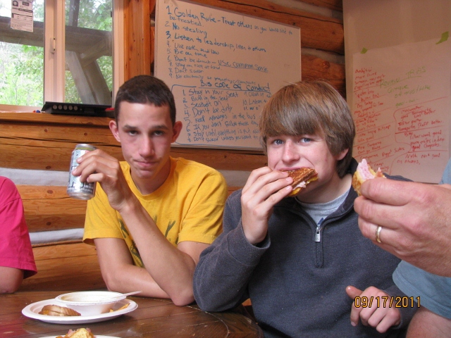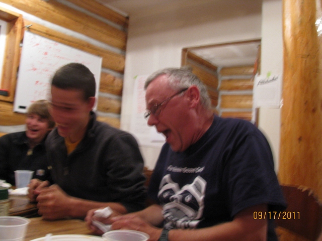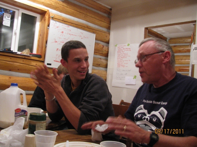These pictures show some of the scenes from the 2011 fall planning session of Troop 100 from Ballard Washington. Paul Hendricks, the scoutmaster and superb chef, sets his kitchen up on the front porch of the cabin. Bill Dunnell, one of the troop bus drivers, helps with the cooking. Bert and Ernie made the rounds of the tents in the morning to wake the boys up. The boys did their planning inside the cabin but took breaks to do service projects around Camp Serendipity. They removed nails from boards and logs from the old trailer snow shelter, and they watered the giant sequoia trees. There was also some good story telling that had everyone laughing. It was a fun and productive weekend.