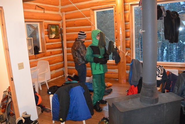 On Sunday morning, after breakfast, the boys donned their snowshoes and followed the scout leaders Bill Dunnell and Chip McElearney into the woods for some training on avalanche hazards and survival techniques. Chip presented pretty much the same class over the same route as last year. He had buried an avalanche beacon in the snow ahead of time and the boys used a second beacon device and probes to locate the buried one. Then they returned to the camp area, packed up their gear, and headed for home at about noon. I stayed behind, had some lunch, and closed up the cabin. I left at 1:00.