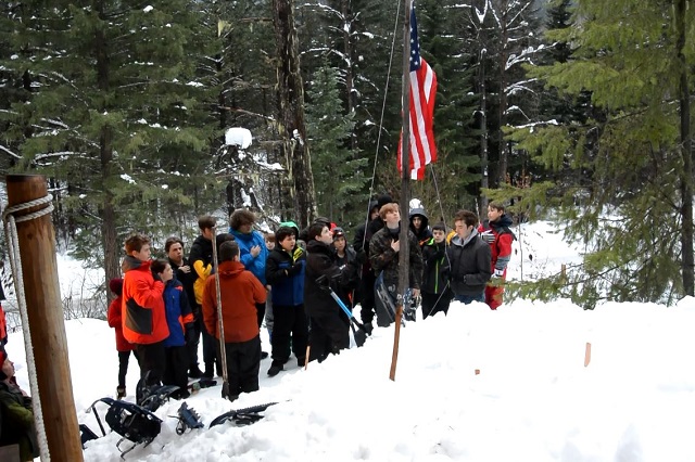 The script for the outing was almost exactly the same as last year. The objective for the camp was to have as many boys as possible sleep in snow caves that they built and to learn techniques for dealing with avalanche hazards. They had a lot of fun playing in the snow, throwing snowballs, sliding down the hills, and digging their snow caves. The boys cooked and ate their meals in their campsites down in the parking area, up by the privy, and in other out-of-the-way places. The adults and scout leaders cooked and ate their meals on the front porch.