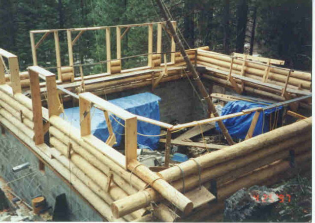 When it is time to raise the scaffold, you will be used to walking on it where it is. There is a nice rail on one side and a fairly high wall on the other side. It feels as secure as walking on a sidewalk on the ground. But after you raise it, it feels a lot different. The wall is now only one log high, there is no handrail (until you put it back on) and the planks rock and wobble (until you shim them). But once you get the handrails and the shims in place, the scaffold feels just as safe and comfortable as before. The whole system works great.