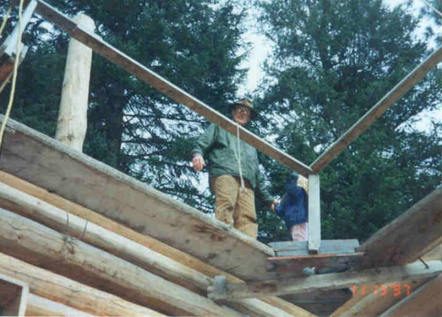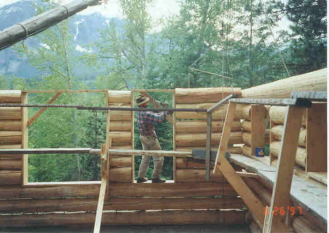 In the next picture you can see that the bracket right behind me is supported by a 2x4 going down to the ground. It is also bolted through the wall. That is because by building the window frames in as I went, the wall didn't have much lateral support at this point and the weight of the scaffolding tended to pull it out of plumb. By adding the 2x4 brace, the wall was held plumb. When it came time to put the full length log over the top of the window frames in this wall, I used a pipe clamp and overlapping 2x4s for the scaffold brace. The pipe clamp went between the ends of the overlapping 2x4s and by turning the handle on the clamp, I could adjust the plumb of the wall and draw it up exactly plumb before I drove the rebar spikes in. Once the spikes were in, the wall had lateral support and it stayed plumb without the scaffold brace. This was a handy side benefit of this scaffold system.