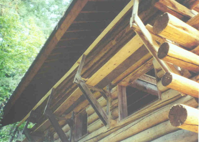 Once the walls were built, the same scaffold system was used on the outside of the building for staining and chinking. In the next picture, you can see the scaffold on an outside wall. You can clearly see the brackets and the undersides of the planks and handrails in this picture.