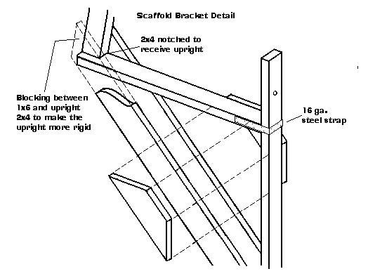 In the corners of the building, the scaffold planks were supported by either a 4x4 or a 2x6 on edge that was bolted to the wall diagonally across the corner with 1/2" threaded rods the same way the brackets were fastened. A 2x6 was used on the corner in this picture. The handrail stanchion for the corners was sort of jury-rigged for each corner. The method shown in this picture worked out pretty well. The stanchion was fastened to the board structure you see. This needed to be removed and re-installed each time the scaffold was raised.